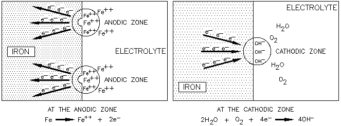 Corrosion results from an electrochemical reaction. It requires an anode, a cathode, a common electrolyte, and an electrical connection between the two zones. The corrosion process results in the flow of a small electric current from the anode to the cathode through the electrolyte. The magnitude of the current which is due to a number of factors is directly proportional to the metal lost due to corrosion. One ampere flowing for one year would result in the loss of 9 kg of steel from a corroding surface.