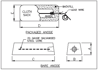 | 4. Backfill mix (D), with low resistivity, is useful in high soil resistivity areas to reduce the anode resistance to earth. |